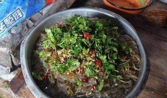 碎粉条泡软,或者下锅稍煮一下,跟葱、姜、蒜和芫荽混合,加五香粉等调料。
