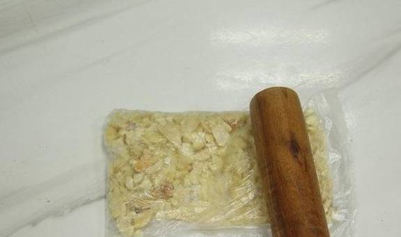 2.花生去皮,装袋子里,用擀面杖敲碎