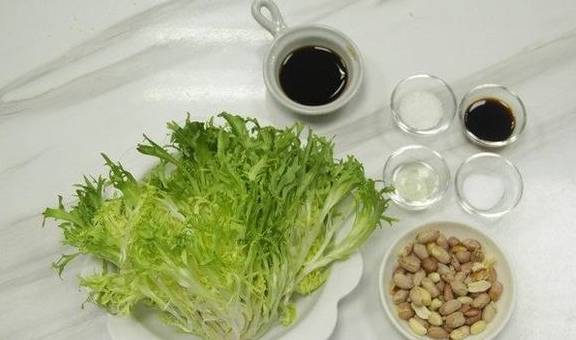 材料苦菊一把、精盐少许 、熟花生50克、生抽适量、陈醋一勺、白糖适量、香油适量
