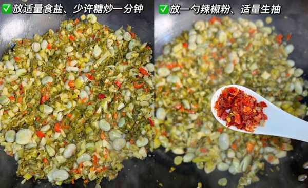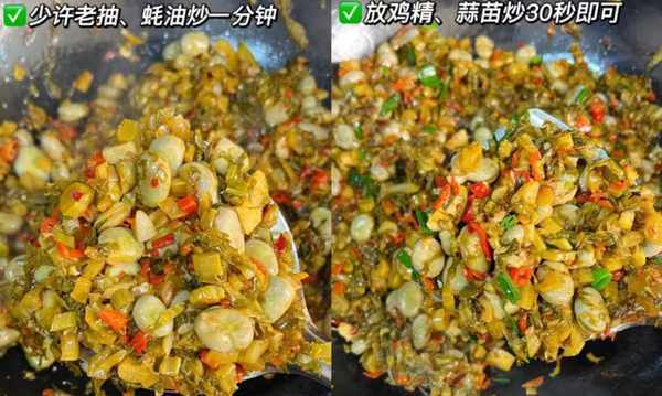 步骤8:加上半勺鸡精,还可以放入一些蒜苗叶子和葱段,大火翻炒均匀,关火装盘,这道酸菜炒蚕豆就可以开吃了,出锅后比肉更受欢迎。