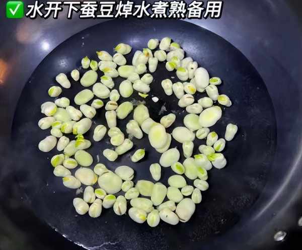 步骤2:锅中煮一小锅冷水,煮沸后加上食盐,倒入蚕豆煮2分钟,捞出过一遍凉水,捞出控干水分。