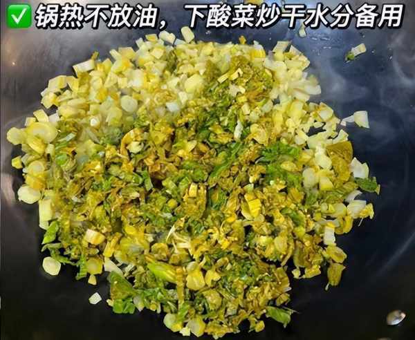 步骤4:锅底提前烧热乎一会儿,倒入一些酸菜炒出水分,准备好蚕豆和酸菜,开始制作这道酸菜炒蚕豆吧。
