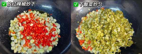 步骤6:放入一些小米辣或剁椒,下入一些酸菜翻炒均匀,还可以调入少许清水,焖2分钟左右。