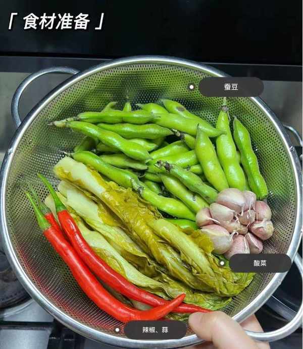 春季来临,三月中旬,草长莺飞,万物出现复苏的景象,到处都是绿油油的一片,外面的景色特别美丽,花儿都开放了,鸟儿也回来了,我们的春天真的来到了。春季是非常困乏的时候,我们经常容易犯困,平常容易出现肠胃不好,还特别容易上火,平常别忘记吃应季蔬菜,比如说蚕豆,豌豆和韭菜等等。今天分享一种蚕豆的家常吃饭——酸菜炒蚕豆,吃起来酸脆入味,好吃又不贵,一上桌就被秒光了。