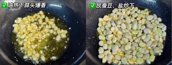 步骤5:锅底多放一些食用油,油温烧至7成热,倒入一些蒜末爆香,放入蚕豆和食盐,快速煸炒至断生。