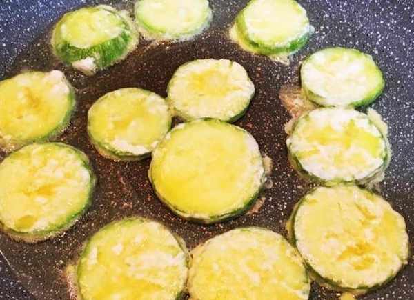 第六步:电热煎锅或平底锅刷一层食用油,然后将包好的西葫芦放入面团中煎至两面金黄,取出即可食用。