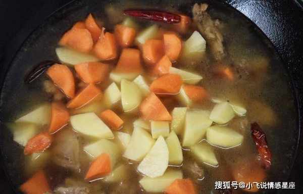 第六步:加入土豆和胡萝卜,继续炖至鸡块半熟。待汤汁快蒸发时,加入青红椒片翻炒至汁液蒸发。