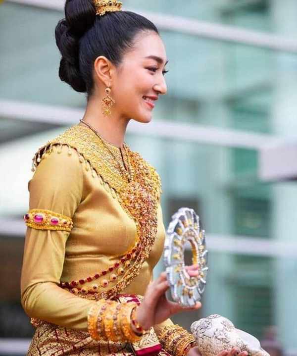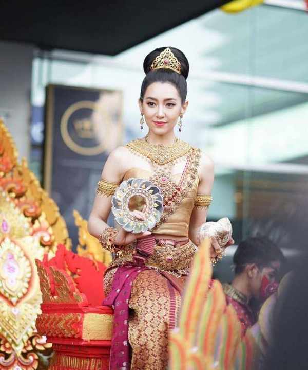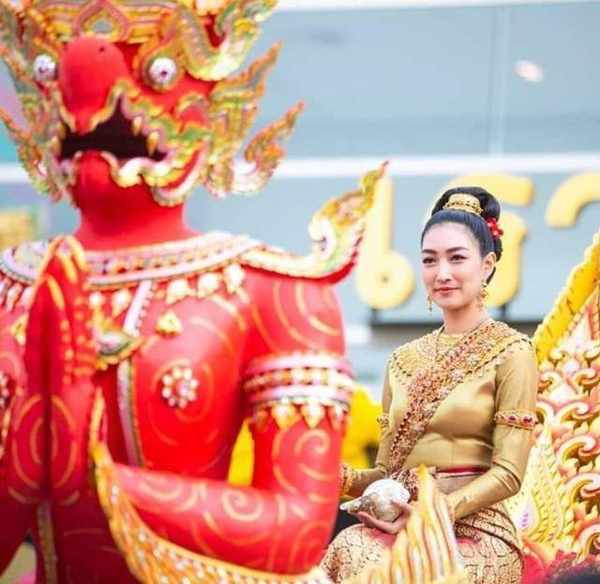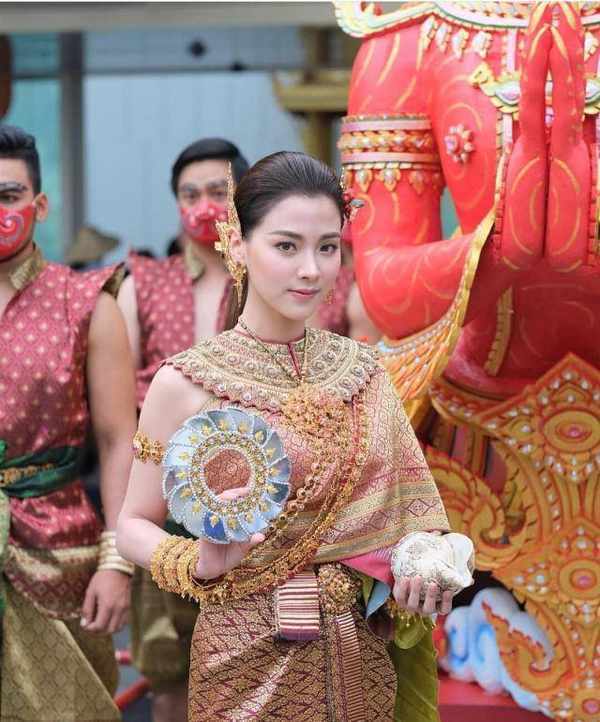 Baifern这次宋干女神的形象也是同其他女星稍有不同,两鬓佩戴金饰,右手深盘齿轮,左手白螺,乘坐迦楼罗游行,马尾束发,简单的发型更衬得Baifern一分清纯。