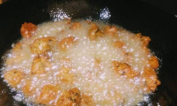 在另一个锅中加热油。油准备好后,加入切碎的大蒜炒香,然后将汁倒入碗中炒至沸腾均匀,然后倒入炸好的丸子。