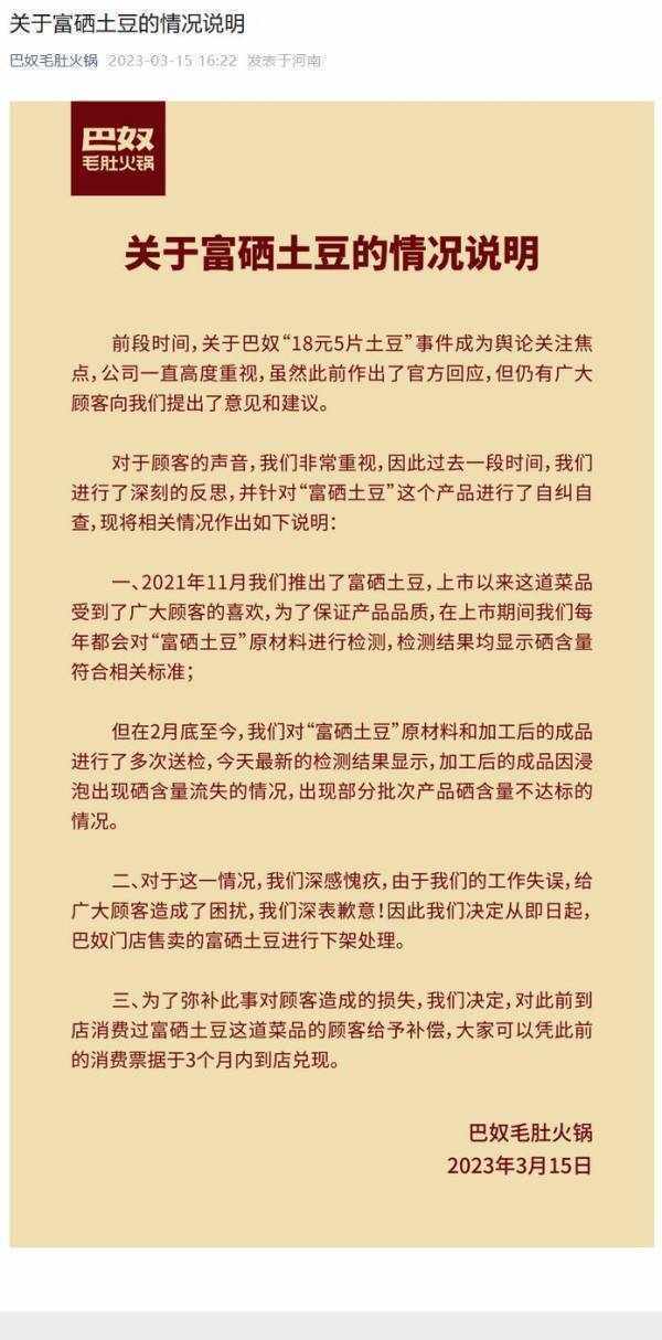 对于这一情况,公司深感愧疚,由于公司的工作失误,给广大顾客造成了困扰,深表歉意!因此决定从即日起,巴奴门店售卖的富硒土豆进行下架处理。为了弥补此事对顾客造成的损失,公司决定,对此前到店消费过富硒土豆这道菜品的顾客给予补偿,大家可以凭此前的消费票据于3个月内到店兑现。