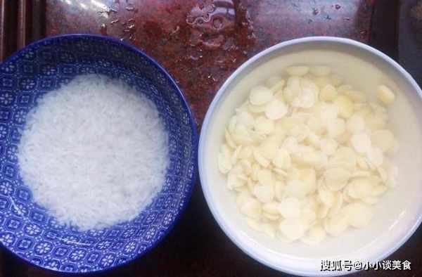 第一步:将杏仁片洗干净;糯米洗净,用水泡软。添加糯米会使杏仁露更香。你不需要添加更多,只需一小把就足够了。