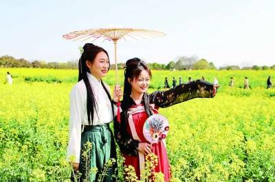 3月15日,汉服爱好者在高淳国际慢城的油菜花田里打卡。南京日报/紫金山新闻 记者 段仁虎 通讯员 高晓平 摄