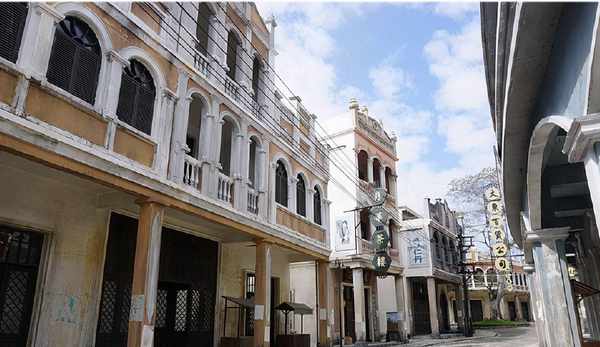 街道不是很宽敞,青石板铺地,两侧多是海南风情的民居,骑楼,一层是商铺,二层是民居,但除了五一节,街道两旁夸张的挂着招牌,有悦华茶社,大东百货,墙上还有庞氏白玉霜的广告等等,一不留神,你以为你穿越到了几十年前的民国。