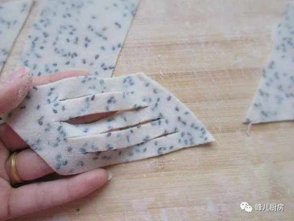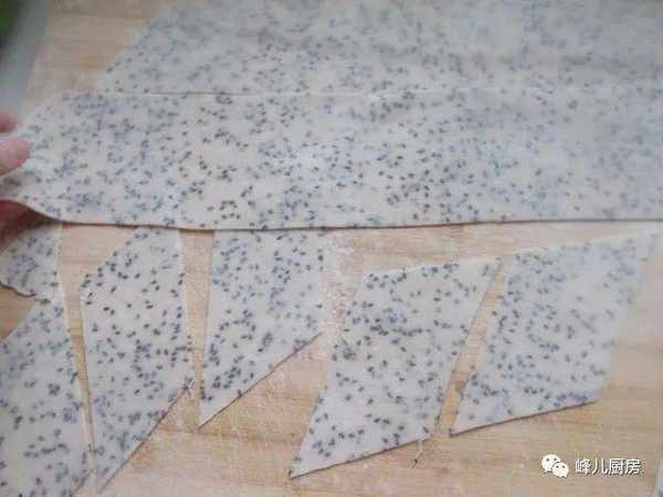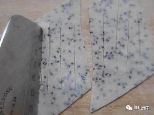4、用擀面杖擀开成薄片,一定要薄一点,切成宽条,再切菱形。