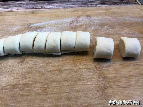 6、用擀面杖把面团擀成薄一点的饼,再把面饼卷成卷,要卷的紧实一些,然后切成小块。