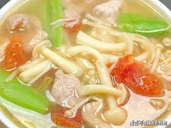 瘦肉,番茄,丝瓜,金针菇,海鲜菇,食盐,白胡椒粉,料酒,淀粉,食用油,鸡精。