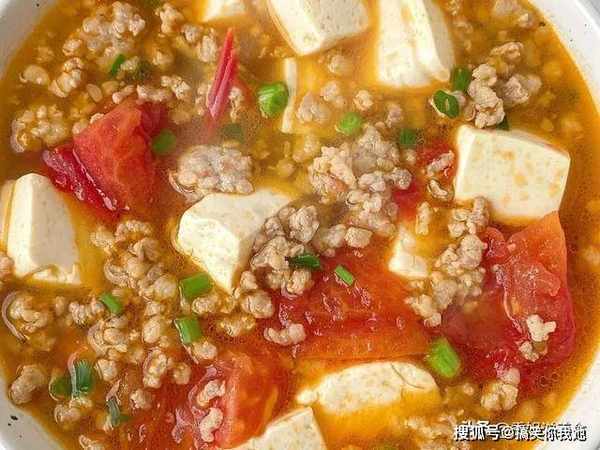 肉末,番茄,水豆腐,葱花,食用油,食盐,生抽,黑胡椒你,料酒,鸡精。