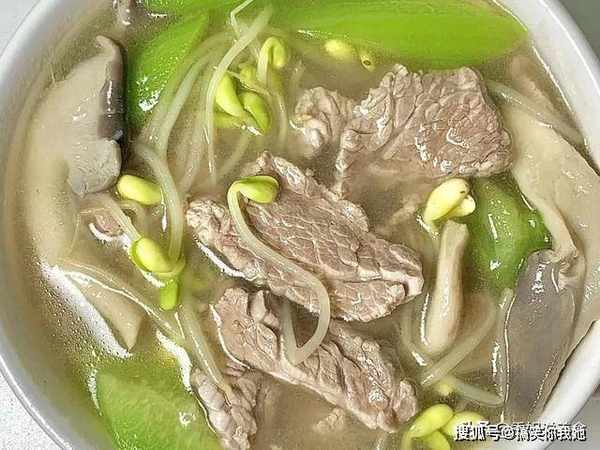 1、牛肉清洗干净切成片,冷水下锅焯水,撇掉浮沫后捞起来控干水分备用。丝瓜去皮后切成块,豆芽和平菇清洗干净即可。