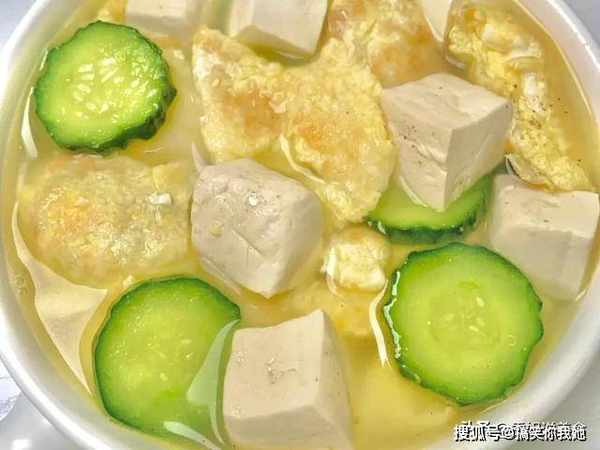 2、起锅烧油,油热放入鸡蛋液煎一下,煮熟后炒散盛出备用。倒入适量开水,煮开后放入水豆腐和黄瓜,煮2分钟。