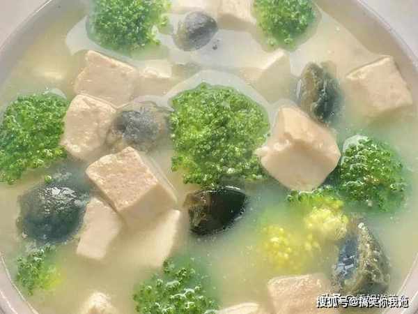 3、起锅烧油,放入姜片、蒜片和皮蛋翻炒几下,再放入开水煮开,然后放入西蓝花和水豆腐煮2分钟。最后加入食盐和胡椒粉调味即可出锅。
