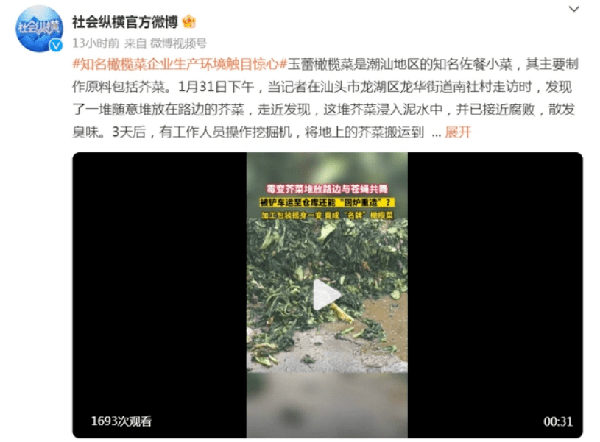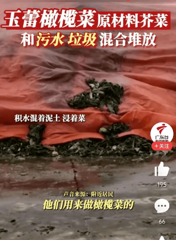 据媒体报道,在汕头市龙湖区龙华街道南社村,有一堆随意堆放在路边的芥菜,走近发现,这堆芥菜浸入泥水中,并已接近腐败,散发臭味。用木棍搅开,还可以看到一只只小的苍蝇,在芥菜上方盘旋。经记者核查,这“一堆芥菜”就是广东知名橄榄菜企业汕头市玉蕾食品实业有限公司制作橄榄菜的原材料,画面触目惊心。