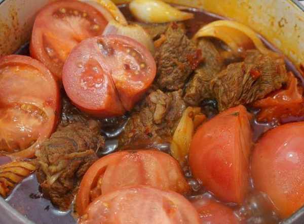 2.将西红柿去掉外皮,放入锅中煎熟。烤汤更容易,这样烤牛肉才好吃。