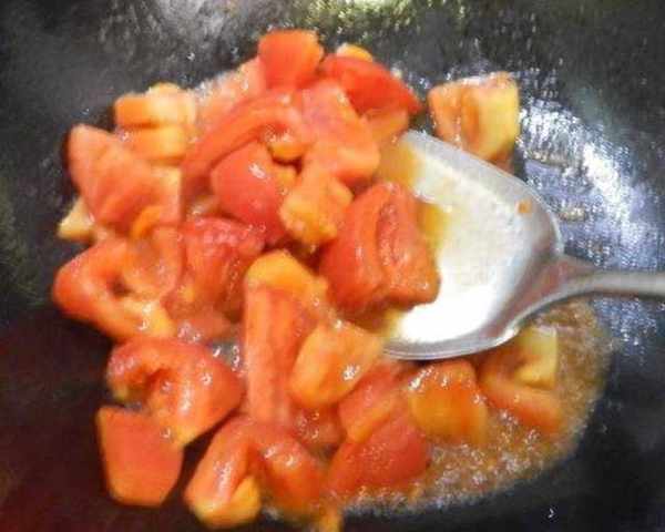 第六步:加入西红柿炒至西红柿出很多汤汁,再撒上适量的糖拌匀。