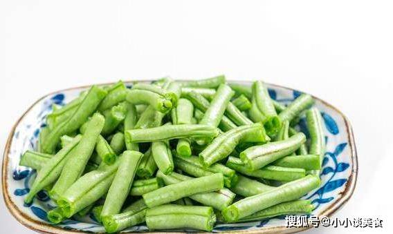大火烧开,然后倒入豆角焯水,待豆角变绿开裂,捞出豆角过水冷却,最后放在砧板上,切成小方块.