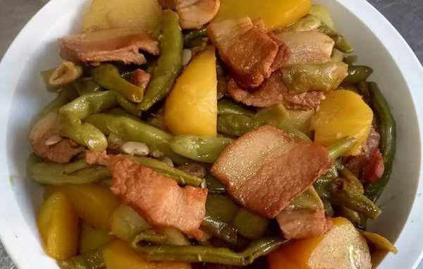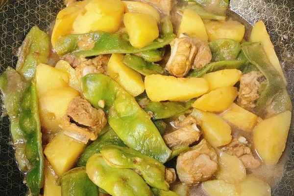 再倒入少许水,大火烧开,转中火煮约30-40分钟。土豆去皮洗净,切成块。将豆子摘洗干净,切成小块。