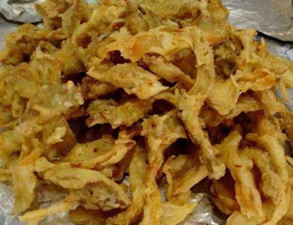 第七步:蘑菇用小火炸至金黄色,捞出控油盛入盘中,撒上烧烤粉即可食用。