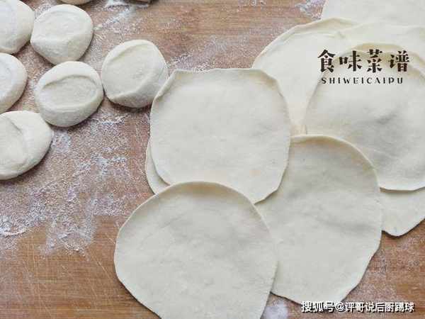 7、撒一层干面粉,防止面团粘连,把面团分割均匀,揉搓成一根长条,茄子剂子大小,正反面各按压一次,擀成饺子皮的形状。