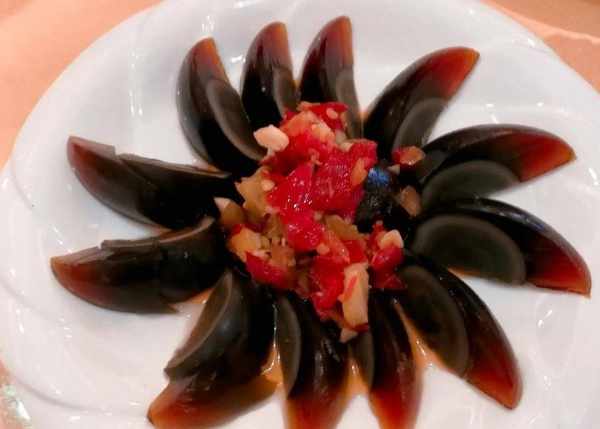 第一道是凉拌皮蛋。凉拌皮蛋有着浓浓的石灰的味道,闻起来很臭。看起来也让人没有食欲,是日本人特别讨厌的美食。
