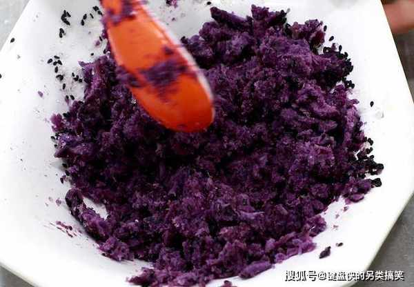 在紫薯块中加入白糖10克,黑芝麻10克,植物油5克,用勺子把紫薯压成紫薯馅备用。