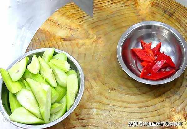 锅内烧水,水烧开以后倒入丝瓜快速焯烫1分钟,丝瓜断生以后放入红椒片,稍微烫一下倒出来备用,丝瓜提前焯水更容易炒熟,口感上生熟一致。