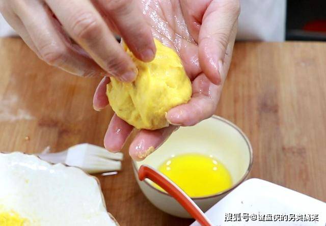 在手上抹点植物油,防止南瓜泥沾手,揪一小块南瓜泥整理成薄片,在上面放上紫薯馅,把开口捏在一起,揪下多余的南瓜泥,在手心里压成圆形的小饼。