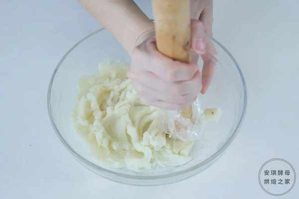 2 用勺子或者擀面杖将蒸好的山药捣成泥。