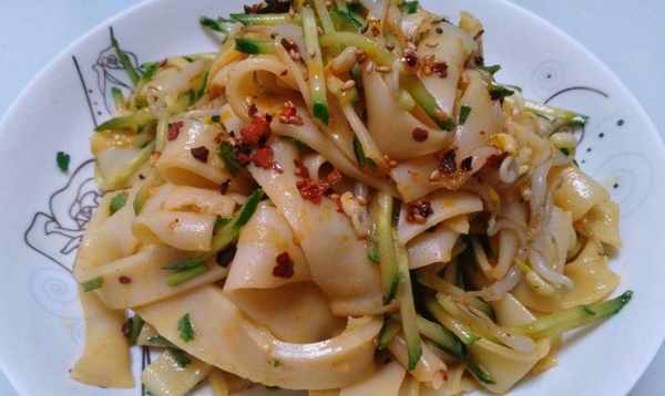 凉皮是陕西特色小吃之一,它以米粉或面粉为主料,配以黄豆芽、黄瓜丝、芝麻酱、辣椒油等佐料,经过简单搅拌调味制作而成。