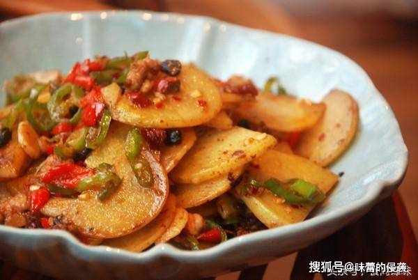 4、下青椒炒到7、8分熟,再放入土豆片炒至变色,加盐,加适量生抽和一点醋,倒入肉片炒匀即可。