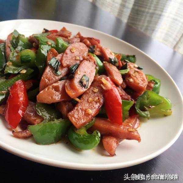 火腿肠2根,豆腐干,蒜少许,青椒or红,老干妈一勺,生抽少少许。