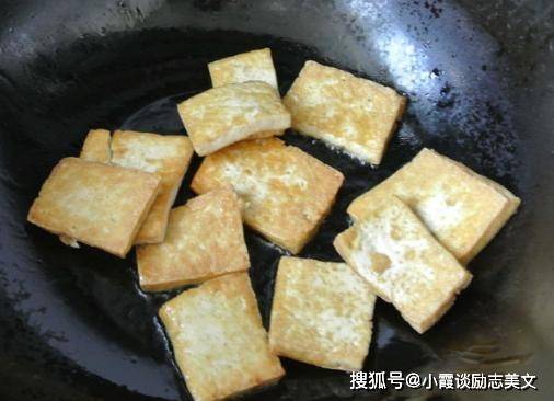 第四步:锅里放油烧热,油热后放入豆腐,用小火慢慢煎至豆腐两面金黄。撒上豆腐控油备用。