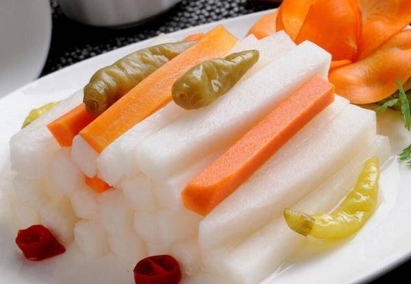在我国许多地方,人们称食用萝卜为“小人参”。这样的赞誉说明萝卜确实营养丰富。萝卜中含有丰富的维生素C,据考证,生吃的萝卜中维生素C的含量比梨高十倍左右。现代研究发现,生萝卜中含有一种抗肿瘤活性物质,能有效抑制癌细胞的形成。此外,萝卜中还含有大量的纤维素,生吃萝卜还能有效促进肠胃蠕动,促进身体的新陈代谢。既然生吃白萝卜有这么多好处,今天就给大家介绍一道生吃白萝卜也能提神醒脑的小菜——“酸萝卜”。