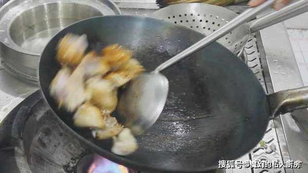 锅里倒入少许油,加一勺冰糖化开。开小火,用勺子不停搅动,糖汁渐渐变成焦糖色。