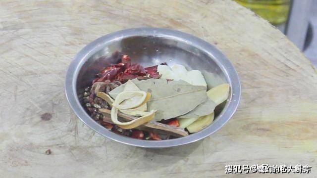 红干椒,一把花椒,两粒八角,两片香叶,一块桂皮,两片陈皮。
