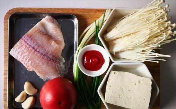 材料:巴沙鱼200克,豆腐一块,金针菇一小把,番茄1个,洋葱,大蒜,番茄酱,料酒,酱油,盐,胡椒粉,油。练习步骤: