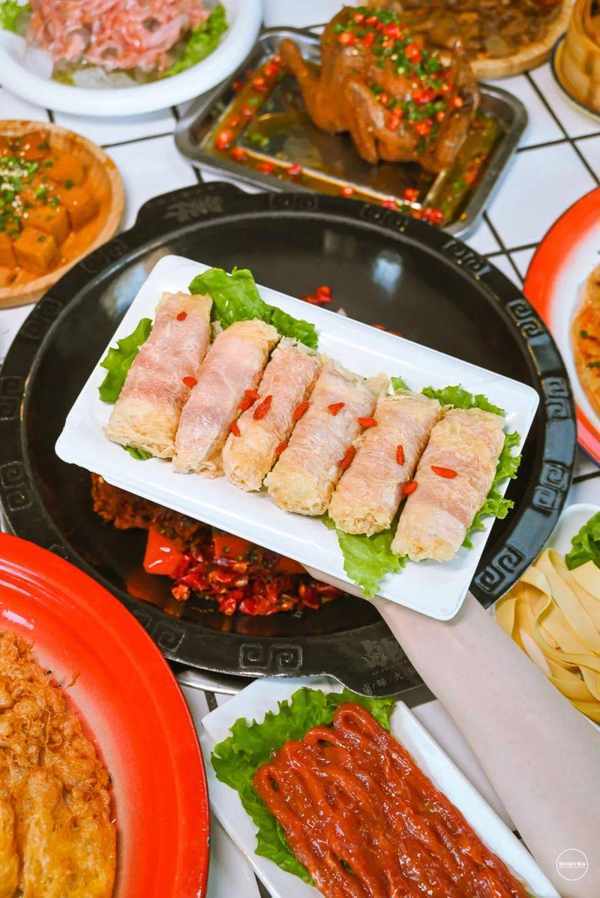 虾肉金丝卷:这一道菜也是很适合涮火锅的菜品,外皮煮一下浸入了很多汤汁,吃起来口感很独特!