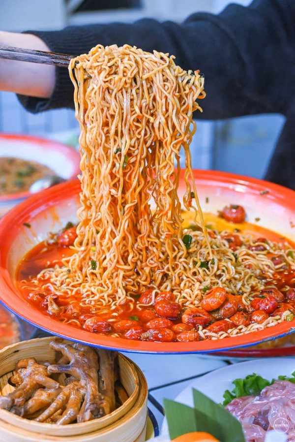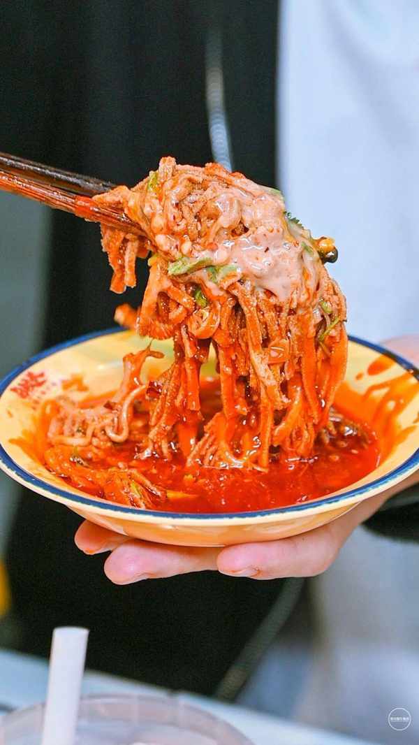 一同在一个大瓷盘里盛着,浇上几勺火锅油,用筷子快速搅拌,每根面条都被浓郁的卤味和麻辣红油包裹着,让人食欲大开!