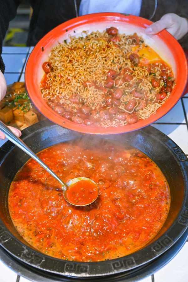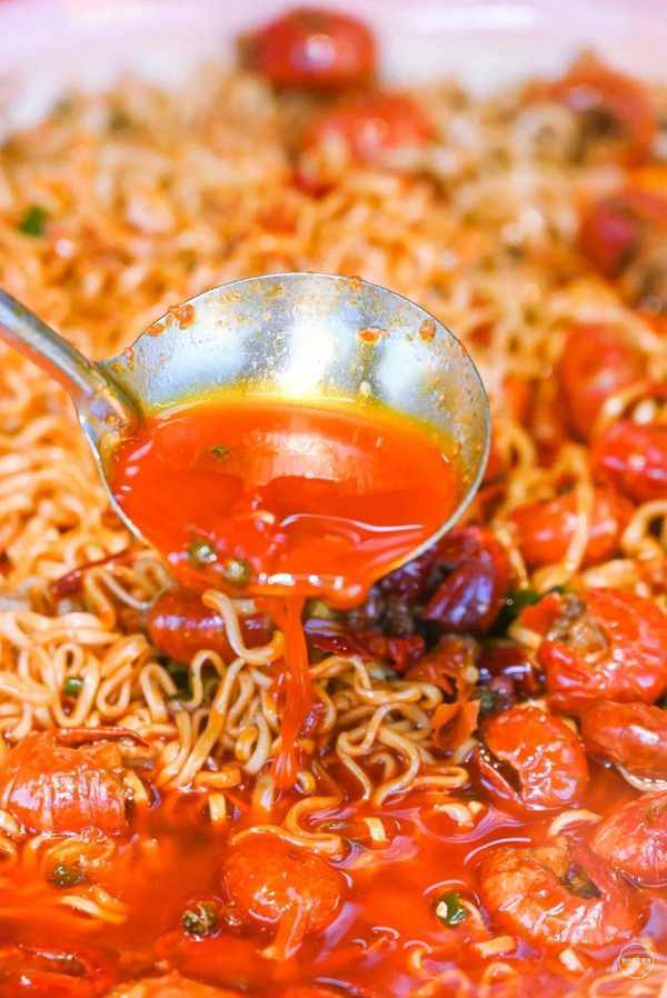 虾尾在吮吸的过程就感受到了卤味的奇妙,麻辣悠长。而火鸡面则真正的遇到了最新的打开方式,爽滑吸溜,停不下来。