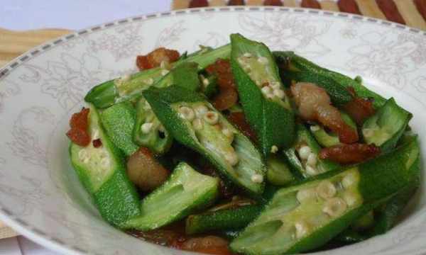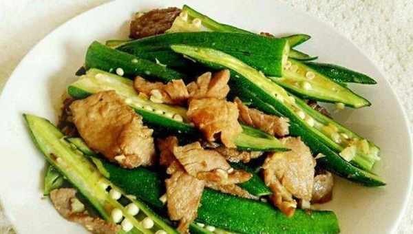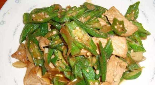 制作步骤:先将秋葵洗净切片,猪肉洗净切片。锅中油烧热,先下肥肉炒香,再下葱姜爆香,再下瘦肉炒熟,再迅速下秋葵,加辣根和香料炒熟。加少许水炒匀,盖上锅盖稍微烧热,即可出锅。