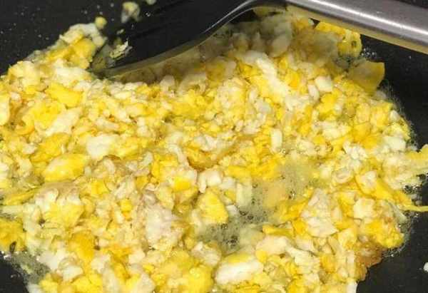 第二步:锅里放油烧热,油烧开后倒入蛋液,待蛋液凝固后煮熟,捣成泥捞出待用。