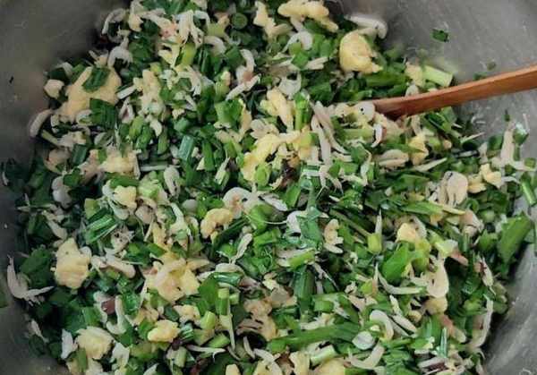 第三步:等鸡蛋裂开放凉,盛入碗中,继续加入韭菜和虾皮,撒上适量的盐和胡椒粉,搅拌均匀成馅。